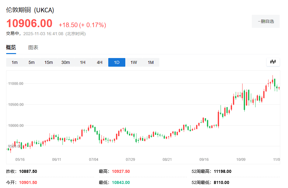 铜价上涨0.2%,至每吨10,903.50美元,略低于每吨11,200美元的历史最高纪录。