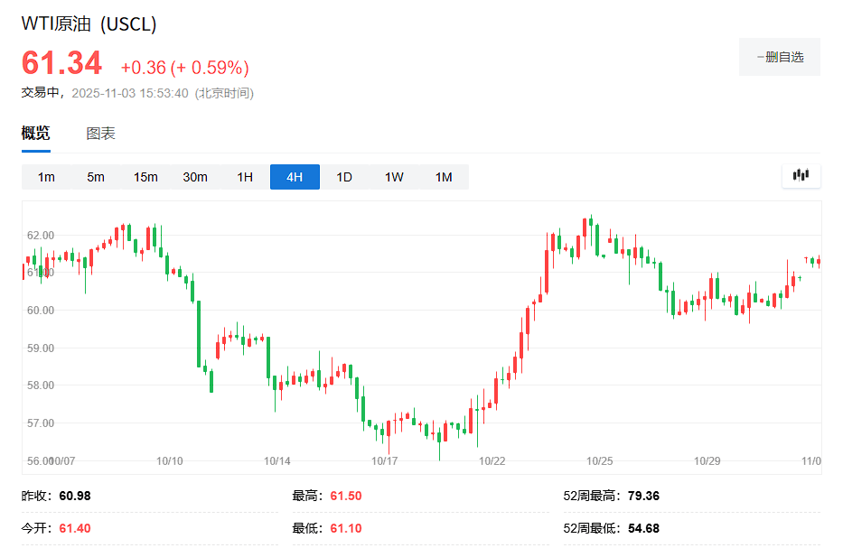石油市场方面,OPEC+决定在下月进行又一次小幅增产后暂停产量增长,推动WTI原油上涨0.6%至每桶61.37美元。