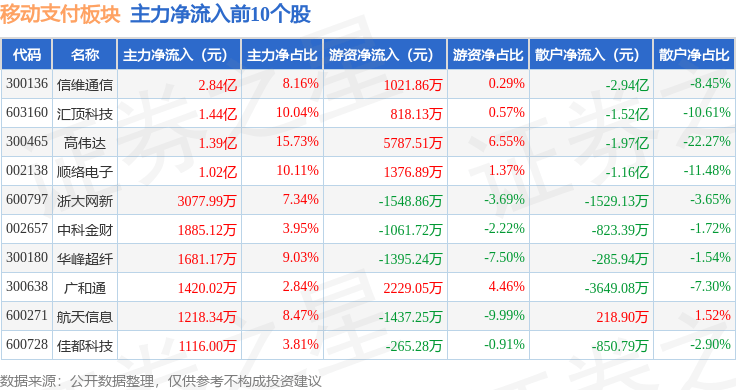 从资金流向上来看,当日移动支付板块主力资金净流出4.21亿元,游资资金净流入6.01亿元,散户资金净流出1.81亿元。移动支付板块个股资金流向见下表: