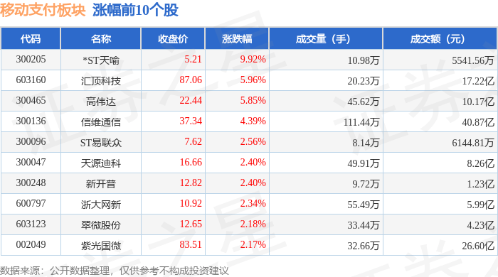 证券之星消息,11月3日移动支付板块较上一交易日上涨0.61%,*ST天喻领涨。当日上证指数报收于3976.52,上涨0.55%。深证成指报收于13404.06,上涨0.19%。移动支付板块个股涨跌见下表: