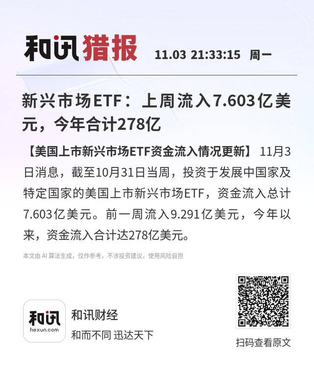 【美国上市新兴市场ETF资金流入情况更新】11月3日消息,截至10月31日当周,投资于发展中国家及特定国家的美国上市新兴市场ETF,资金流入总计7.603亿美元。前一周流入9.291亿美元,今年以来,资金流入合计达278亿美元。