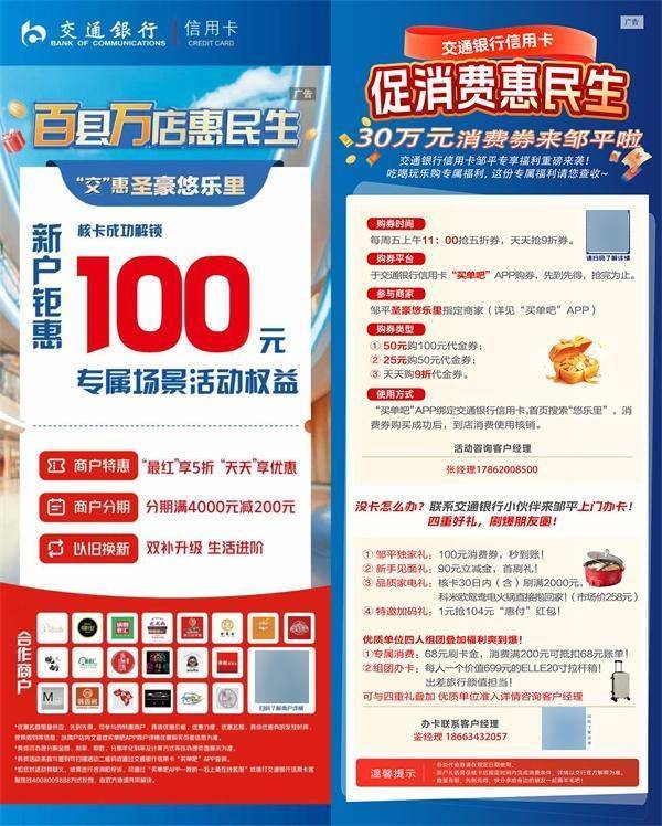 鲁网11月4日讯交通银行信用卡“促消费惠民生”福利重磅来袭——30万元消费券已登陆邹平圣豪悠乐里。