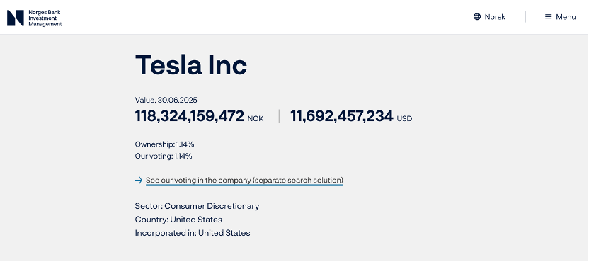 该基金是全球同类基金中规模最大的一家,同时也是特斯拉的第七大单一股东。官网显示,该基金持有特斯拉1.14%的股份。该项投资的价值约为1183亿挪威克朗(约合117亿美元)。