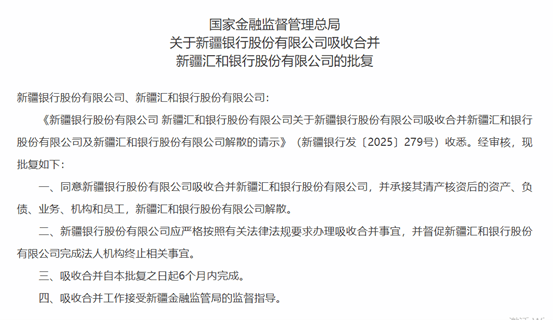 而国家金融监管总局官网最新信息显示,该局已于9月底批复新疆银行吸收合并汇和银行,并承接其清产核资后的资产、负债、业务、机构和员工,汇和银行解散。
