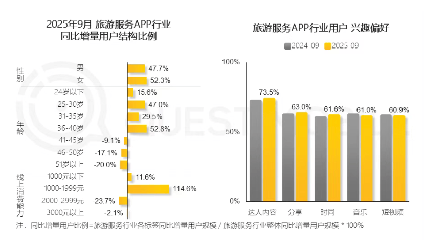 同时,该报告也统计了旅游服务APP行业的用户结构,发现旅游服务行业的年轻用户占比正显著提升,这一人群特征也成为推动大众偏向自主旅游出行的重要因素。以及,年轻群体对达人创作内容、旅行体验分享的关注度与参与意愿,也在持续增强。