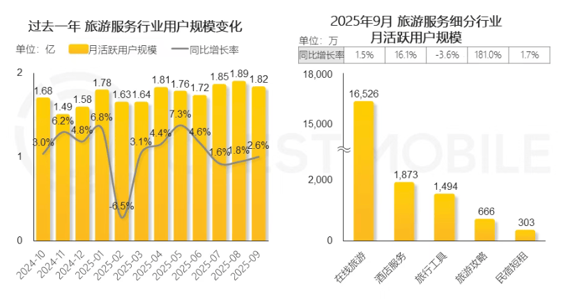 11月4日,QuestMobile发布2025中国移动互联网秋季大报告,其中提及旅游行业流量近年普涨,从各旅游平台获取旅游攻略和酒店服务成了增长趋势,多数旅游平台从微信小程序和自有APP作为获取流量渠道,仅飞猪仍从支付宝获取,马蜂窝从百度引流。