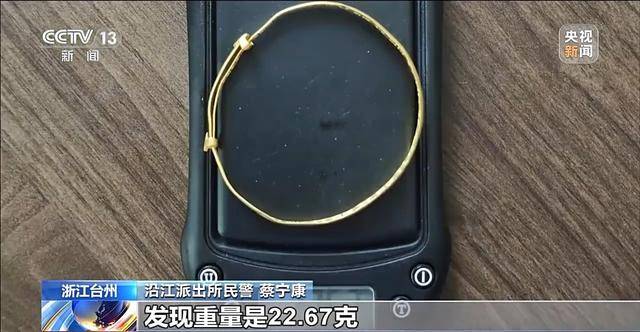 沿江派出所民警 蔡宁康:我们到现场随即对金手镯进行称重,发现重量是22.67克,我们让阿姨提供了当时购买黄金的发票,上面显示重量是28克,一对比,少了5.33克。