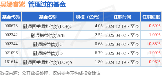 吴嫣睿紫女士:中国国籍,复旦大学硕士,具有基金从业资格。2016年7月至2020年2月就职于汇添富基金管理有限公司任信用研究员,2020年2月至2020年8月就职于中信银行资产管理业务中心任投资经理,2020年8月至2024年9月就职于信银理财有限责任公司任投资经理。2024年9月加入融通基金管理有限公司。2024年12月19日起担任融通四季添利债券型证券投资基金(LOF)的基金经理。2025年4月2日起担任融通增益债券型证券投资基金基金经理。