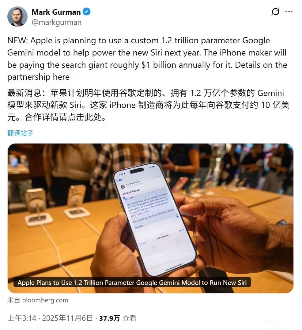 苹果计划每年向谷歌支付大约10亿美元,以此获得定制化Gemini模型的使用授权,其中核心采用的版本是拥有1.2万亿参数的Gemini 2.5 Pro。
