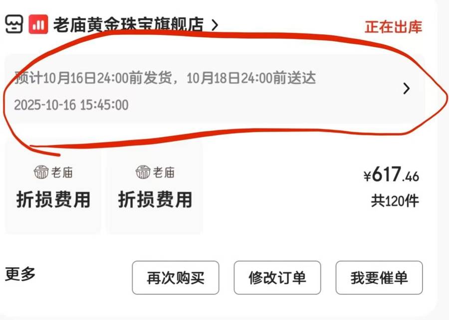 10月16日,苗女士突然收到客服消息,称她购买的手镯“出货了”。客服表示,由于当前实际出货手镯总重为25.71克,超过下单时的重量0.73克,需要她按照下单时的金价补上差价。“承诺补完差价后,48小时之内发货。”眼看终于能拿到手镯,苗女士毫不犹豫地再次支付了617元,然而,直到10月20日下午,商家依然在以“催促仓库”为由拖延发货。