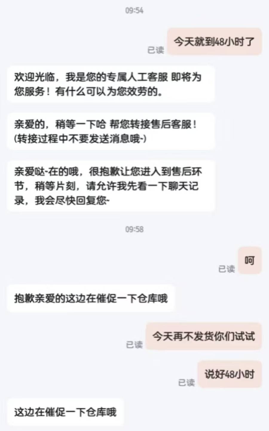 △补上差价后,商家并不发货,一直表示“催促仓库”。