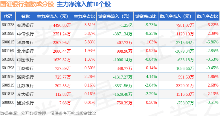 资金流向方面,国证银行(399431)指数成份股当日主力资金净流出合计12.39亿元,游资资金净流入合计1.2亿元,散户资金净流入合计11.18亿元。成份股资金流向详情见下表: