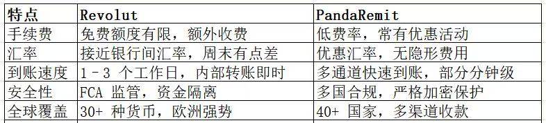 通过对 Revolut vs 熊猫速汇PandaRemit的比较可以发现,两者各有优点。Revolut 更适合欧洲内部或 Revolut 用户之间的转账,而 PandaRemit 则在费用、汇率和到账速度上更具竞争力。