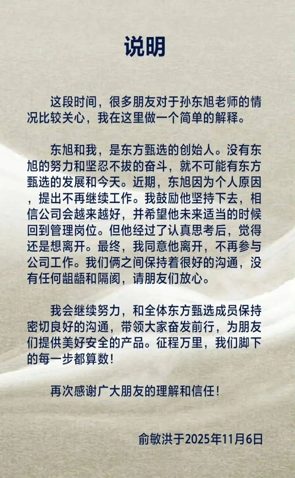 俞敏洪在说明中提到,“东旭和我,是东方甄选的创始人。没有东旭的努力和坚忍不拔的奋斗,就不可能有东方甄选的发展和今天。近期,东旭因为个人原因提出不再继续工作。我鼓励他坚持下去,相信公司会越来越好,并希望他未来适当的时候回到管理岗位。但他经过了认真思考后,觉得还是想离开。最终,我同意他离开,不再参与公司工作。我们俩之间保持着很好的沟通,没有任何龃龉和隔阂,请朋友们放心。”