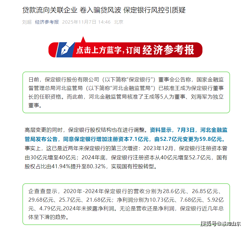 高层变更的同时,保定银行股权结构也在进行调整。资料显示,7月3日,河北金融监管局发布公告,同意保定银行增加注册资本7.1亿元,由52.7亿元变更为59.8亿元。事实上,这已是近两年来保定银行的第三次增资:2023年12月,保定银行注册资本曾由30亿元增至40亿元;2024年底,保定银行注册资本从40亿元增至52.7亿元,国有股权占比由41.94%提升至80.32%,实现国有控股转型。