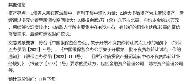 华夏银行在公告中表示,上述不良贷款的“资产亮点”包括:债务人所在区域集中,有利于集中清收力量;绝大多数资产为未诉讼资产,后续通过多元处置手段清收空间较大;借款人年龄主要集中在40岁左右,具有较好的职业能力和较高的征信修复需求,后续可清收时间较长。