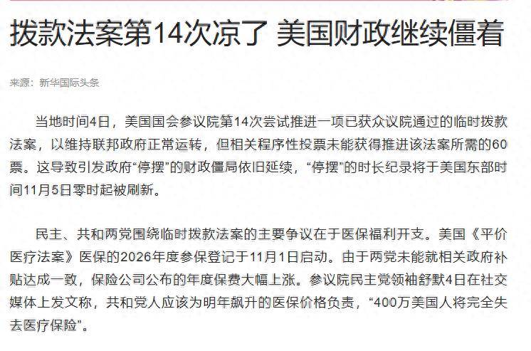 当地时间11月4日,美国参议院进行了第14次投票,结果又以失败告终——临时拨款法案(简称CR)再次没能通过。这项法案被形象地称为“临时零花钱”方案,它的再次失败对特朗普来说是一次沉重打击。
