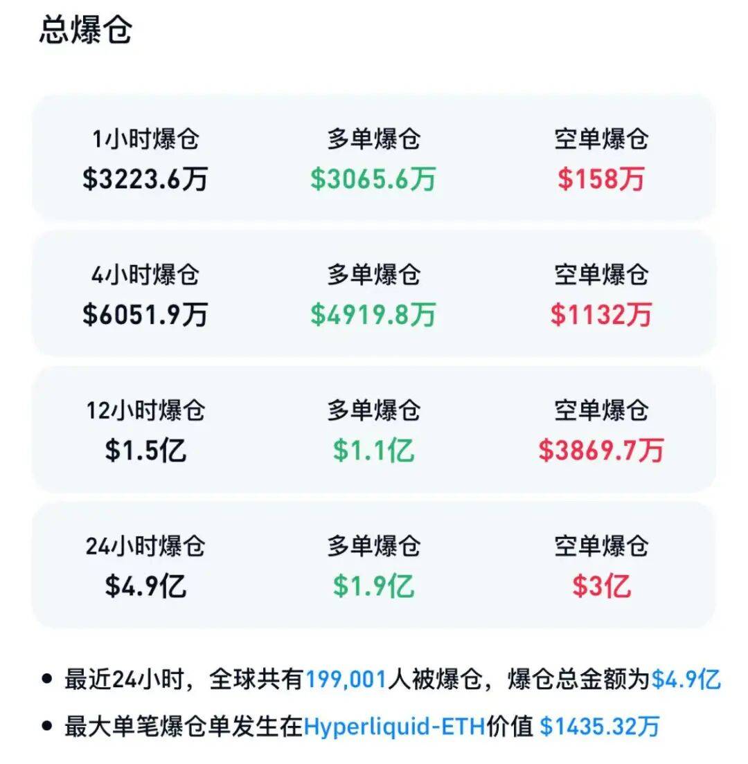 CoinGlass数据显示,最近24小时,加密货币全球共有近20万人爆仓,爆仓资金近5亿美元。