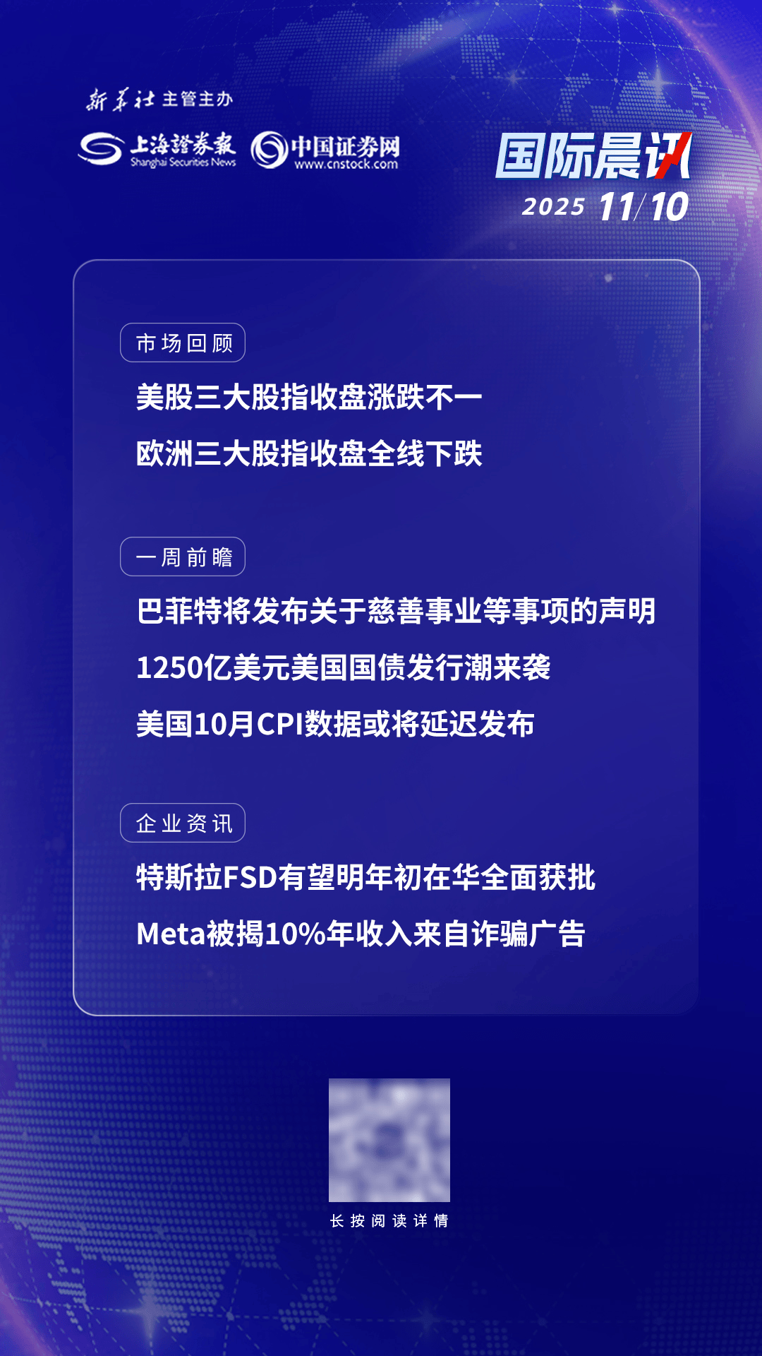 美国单日航班取消超两千,白宫顾问说“停摆”或致负增长;巴菲特将发布关于慈善事业等事项的声明;1250亿美元美国国债发行潮来袭;美国10月CPI数据或将延迟发布;特斯拉FSD有望明年初在华全面获批;Meta被揭10%年收入来自诈骗广告。