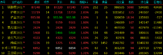 2025年11月10日,国内主力合约涨多跌少。碳酸锂涨超7%,沪银涨超2%,沪金、苹果、氧化、纸浆、液化气(LPG)、纯碱涨超1%;跌幅方面,玻璃跌近3%,集运欧线、沥青、、鸡蛋跌超1%。