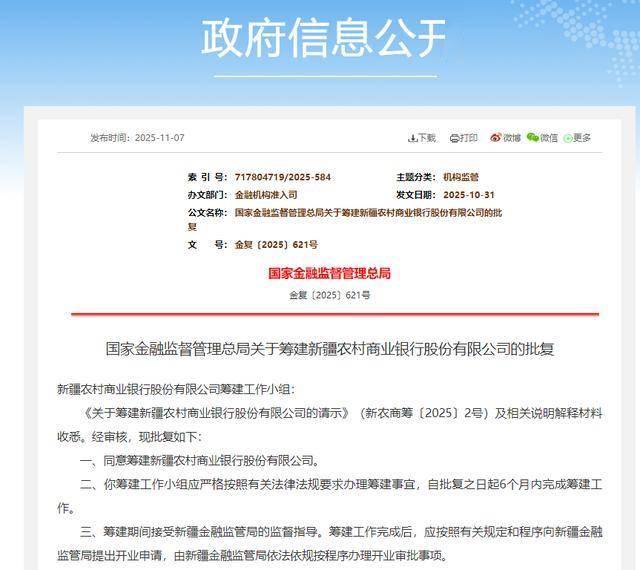 瑞财经 王敏 11月7日,国家金融监督管理总局官网公示,正式核准新疆农村商业银行股份有限公司的筹建申请。