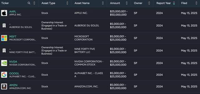 佩洛西2024年的财务披露报告显示,她当时持有约24只个股,包括英伟达、Salesforce、奈飞、苹果等公司,其中苹果是她最大的持仓股票,价值在2500万至5000万美元。