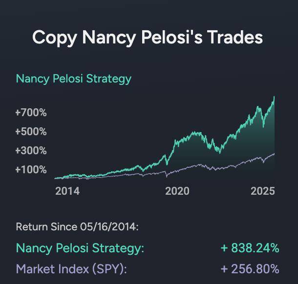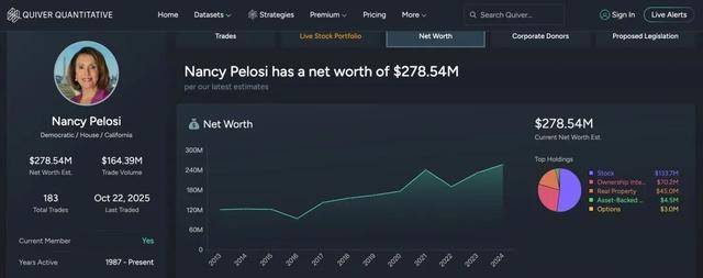 据Quiver Quantitative显示,佩洛西和她的丈夫在佩洛西于国会任职的38年间,通过股票交易获利超过1.3亿美元——回报率高达16930%。相比之下,道琼斯指数同期的涨幅为2300%。佩洛西一家如今的资产约2.8亿美元,而她刚进入国会时,家庭资产约为300万美元。