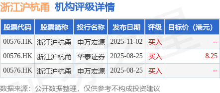 投行对该股的评级以买入为主,近90天内共有3家投行给出买入评级,近90天的目标均价为8.25港元。申万宏源最新一份研报给予浙江沪杭甬买入评级。