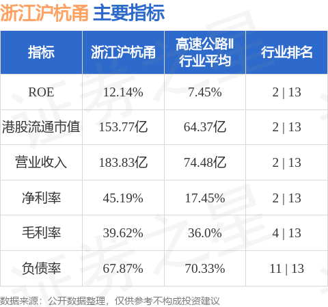 浙江沪杭甬港股市值153.77亿港元,在高速公路Ⅱ行业中排名第2。主要指标见下表: