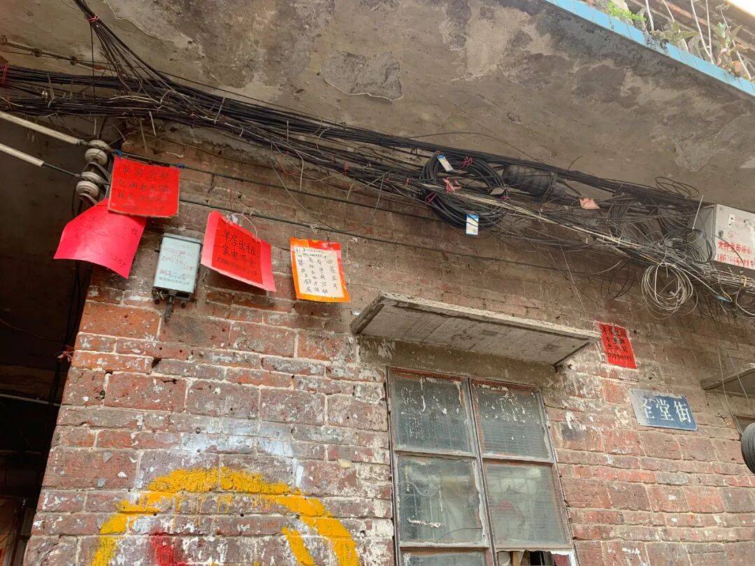 村内多为破旧的红砖民房与逼仄的握手楼,道路拥挤且不规则,电线杂乱无章。