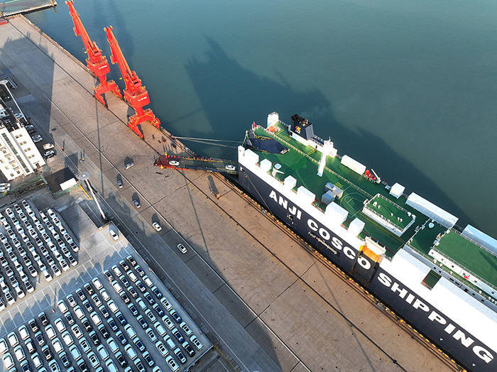 2023年12月2日,在江苏连云港港东方港务分公司码头,滚装轮停靠在59泊位装载汽车出口墨西哥。视觉中国