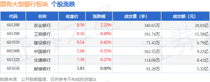 从资金流向上来看,当日国有大型银行板块主力资金净流入4.13亿元,游资资金净流出1.88亿元,散户资金净流出2.24亿元。国有大型银行板块个股资金流向见下表: