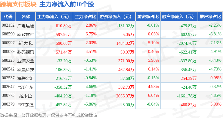 从资金流向上来看,当日跨境支付板块主力资金净流出19.04亿元,游资资金净流入3.53亿元,散户资金净流入15.51亿元。跨境支付板块个股资金流向见下表: