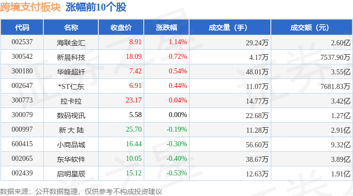 证券之星消息,11月11日跨境支付板块较上一交易日下跌1.43%,高伟达领跌。当日上证指数报收于4002.76,下跌0.39%。深证成指报收于13289.0,下跌1.03%。跨境支付板块个股涨跌见下表: