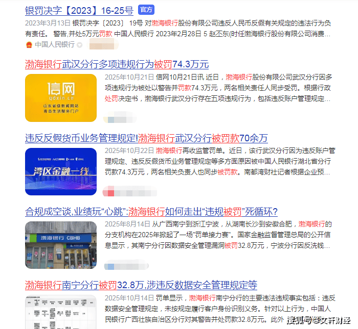 2025年10月,渤海银行股份有限公司武汉分行因多项违规行为被处以警告并罚款74.3万元,两名相关责任人同步受罚。