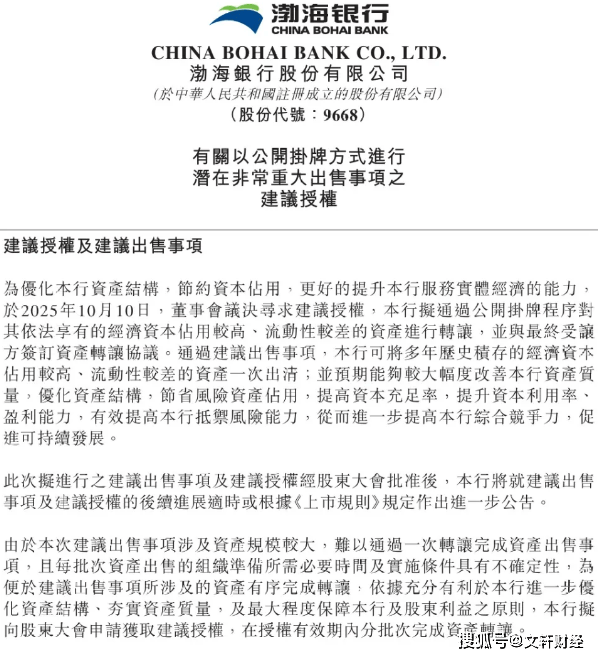 近日,渤海银行股份有限公司(以下简称“渤海银行”)在港交所发布公告,拟通过公开挂牌程序转让合计近700亿元的债权资产,这是该行近年来规模最大的一次资产处置行动。