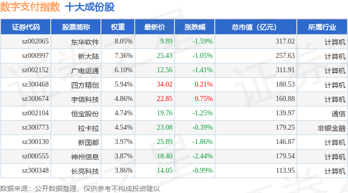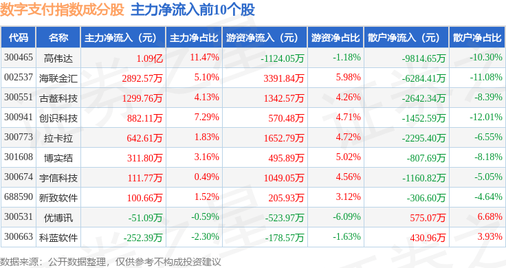 资金流向方面,数字支付(980113)指数成份股当日主力资金净流出合计14.4亿元,游资资金净流入合计3.25亿元,散户资金净流入合计11.15亿元。成份股资金流向详情见下表: