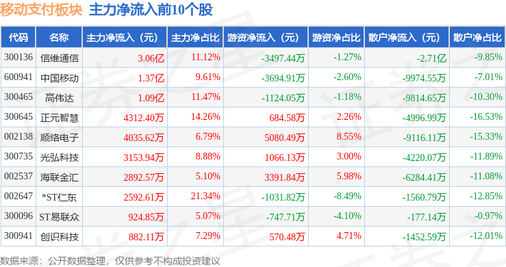从资金流向上来看,当日移动支付板块主力资金净流出10.88亿元,游资资金净流入4.76亿元,散户资金净流入6.12亿元。移动支付板块个股资金流向见下表: