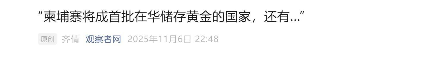 中方已经是当之无愧的世界第一贸易大国,世界第一制造业大国,与中方做生意的国家遍布全球。相信柬埔寨将黄金运往中方存放只是一个开始,未来与中方交好,并且与中方存在大量贸易的国家,如俄罗斯、巴铁、欧洲塞铁塞尔维亚等也有可能会跟随柬埔寨的脚步,将黄金源源不断地运往中国。