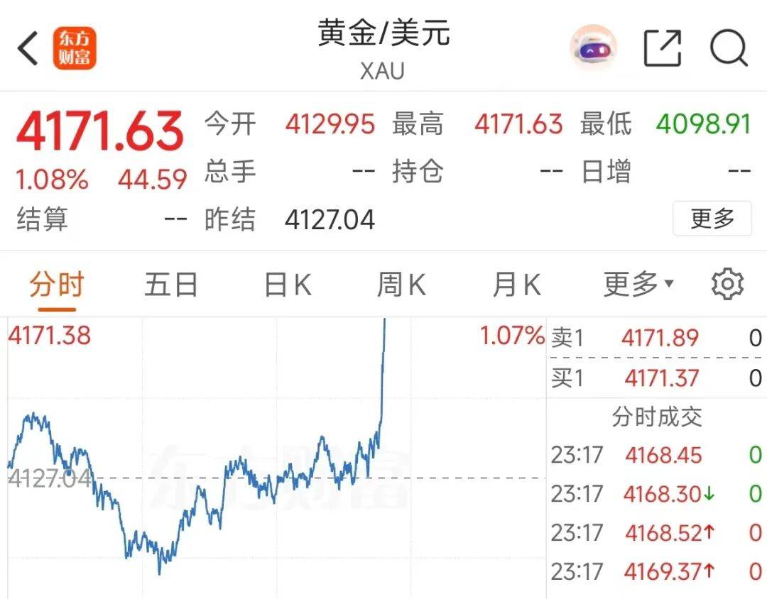 11月12日晚,现货黄金突破4170美元,日内上涨超1%。