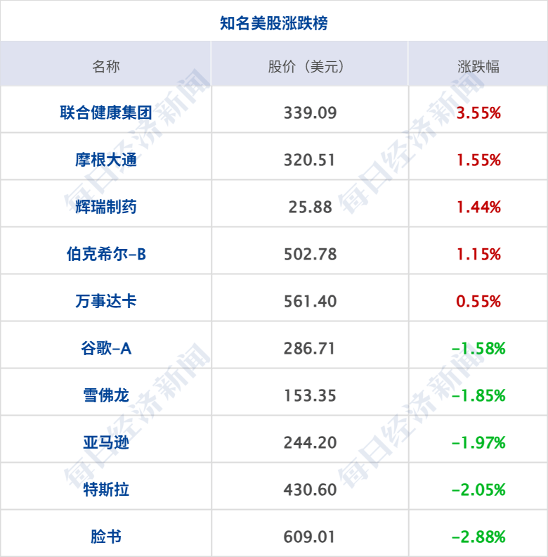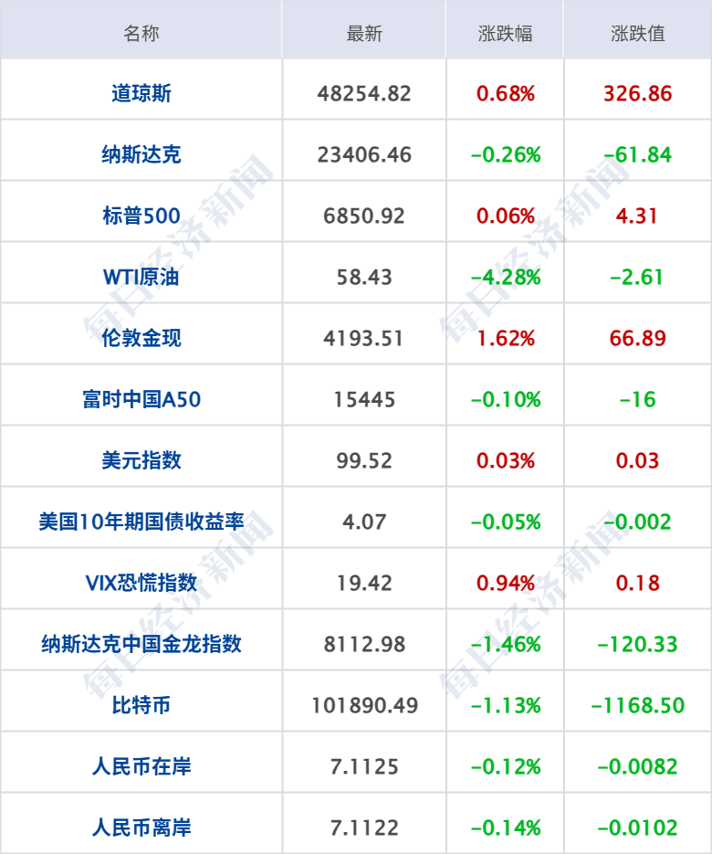 美股三大指数收盘涨跌不一,道指涨0.68%续创收盘新高,纳指跌0.26%,标普500指数涨0.06%;银行股普涨,杰富瑞涨超5%,高盛涨超3%,花旗、摩根士丹利涨超2%;黄金股走强,赫克拉矿业、哈莫尼黄金涨超5%;大型科技股涨跌互现,AMD涨9%,甲骨文跌超3%,特斯拉跌超2%。中概股多数下跌,纳斯达克中国金龙指数跌1.46%;小鹏汽车、蔚来、爱奇艺、百度跌超2%,理想汽车、阿里巴巴、京东跌超1%。