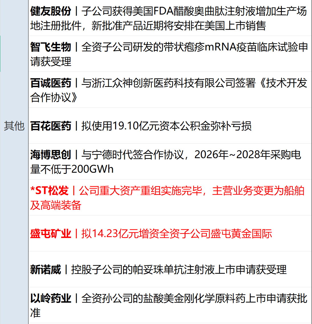 天齐锂业(SZ002466,股价54.10元,市值887.8亿元):11月12日,天齐锂业公告,2025年11月12日,公司全资子公司Inversiones TLCSpA(以下简称“天齐智利”)收到智利圣地亚哥上诉法院就本次诉讼作出的判决书,其驳回了天齐智利于智利当地时间2024年7月26日提交的诉讼请求。根据智利相关法律规定,该判决非终审判决,公司将在法律允许的范围内全面评估,不排除考虑在确保相关股东利益得到保障的前提下可能采取进一步行动(包括但不限于提起上诉)。