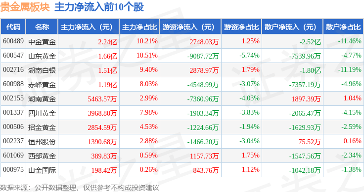从资金流向上来看,当日贵金属板块主力资金净流入8.03亿元,游资资金净流出1.7亿元,散户资金净流出6.33亿元。贵金属板块个股资金流向见下表: