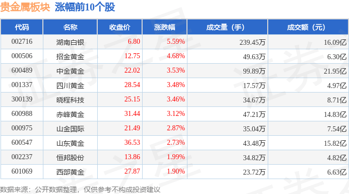 证券之星消息,11月13日贵金属板块较上一交易日上涨2.98%,湖南白银领涨。当日上证指数报收于4029.5,上涨0.73%。深证成指报收于13476.52,上涨1.78%。贵金属板块个股涨跌见下表: