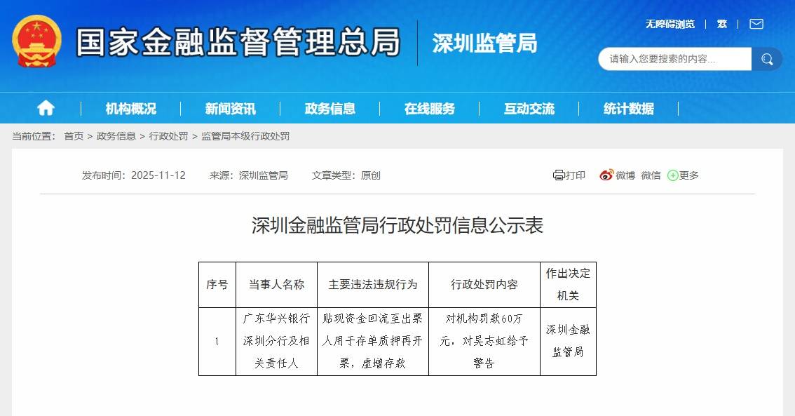 人民网深圳11月13日电 (刘森君)近日,深圳金融监管局公示行政处罚信息,广东华兴银行深圳分行因贴现资金回流至出票人用于存单质押再开票,虚增存款,被罚款60万元。