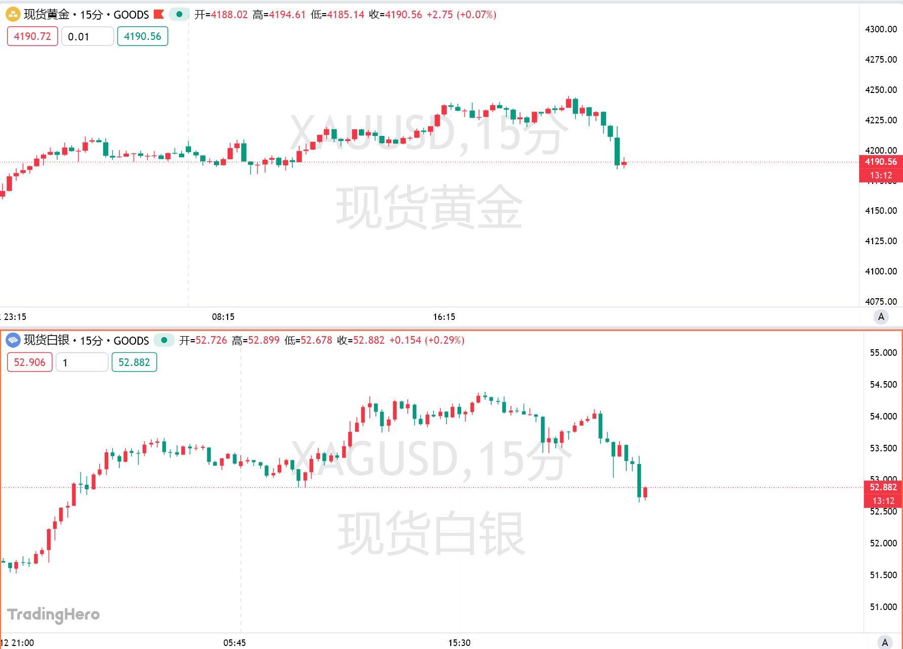 周四美盘初,现货黄金回吐日内涨幅,短线走低16美元,一度逼近4180美元/盎司;现货白银日内转为下跌1%,失守53美元/盎司。
