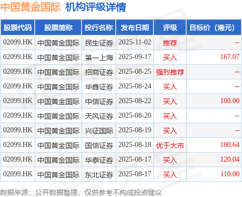 投行对该股的评级以买入为主,近90天内共有7家投行给出买入评级,近90天的目标均价为119.55港元。民生证券最新一份研报给予中国黄金国际推荐评级。