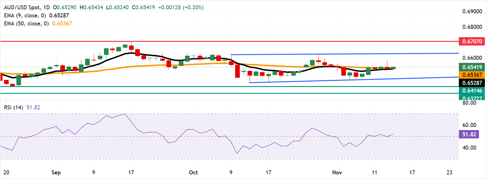 技术层面显示,澳元兑美元在0.6540附近交投,维持在50日指数移动均线上方。日线图呈现矩形整理形态,短期动能指标偏向积极。若突破0.6630的矩形上轨,可能推动汇率测试9月高点0.6707。下行方面,0.6536的50日均线与0.6528的9日均线构成初步支撑,失守后可能下探0.6470的矩形下轨及8月低点0.6414。