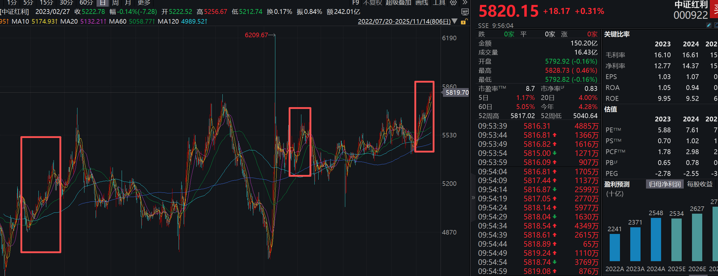而自从上证指数来到4000点关口以来,红利指数突然放量上攻,前期表现平平的消费板块这两天强势领跑全市场,尤其是白酒板块在三季报披露后基本面承压的情况下却走出逆势上扬的行情