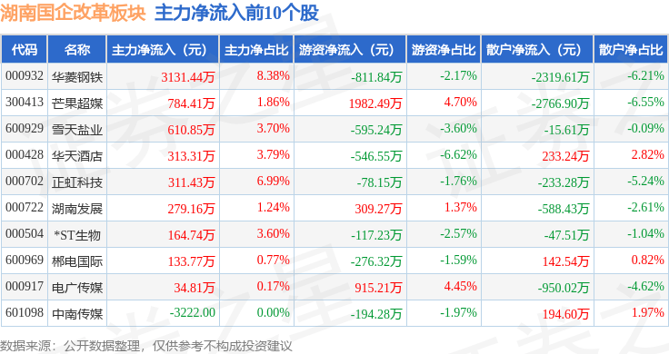 从资金流向上来看,当日湖南国企改革板块主力资金净流出8.77亿元,游资资金净流入9362.2万元,散户资金净流入7.83亿元。湖南国企改革板块个股资金流向见下表:
